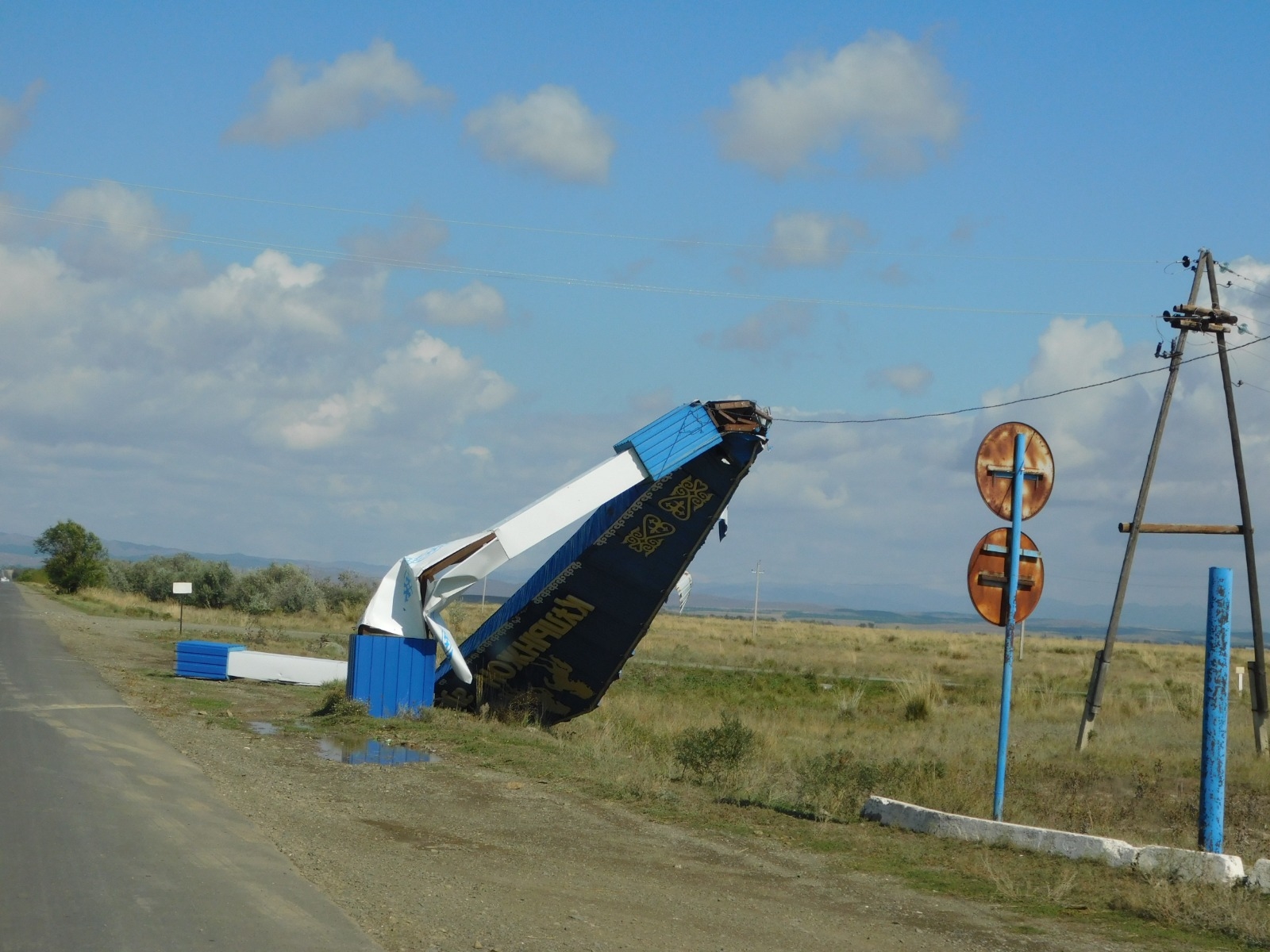 Сегодня въезд в село Кулынжон района Самар вместо парадных ворот украшает покорёженная металлическая конструкция, передаёт корреспондент YK-news.kz.